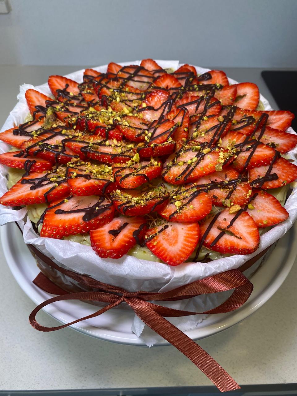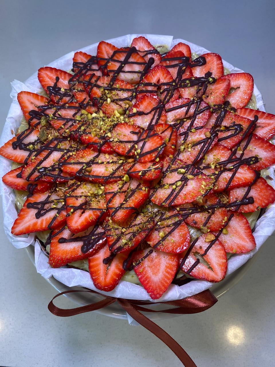 Nuestro delicioso Cheesecake Vasco de chocolate llega con la nueva tendencia Dubai, tiene masa de Cheesecake de Chocolate 55% cubierto con Brigadeiro de Pistacho, katafi tostado y Fresas.